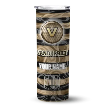 The Personalized Vanderbilt Commodores Camo Texture Black Skinny Tumbler tumbler is the perfect way to stay refreshed while showing off your pride for Vanderbilt Commodores. With its double-wall insulation, your drinks stay at the right temperature for hours, whether you're enjoying a hot coffee or keeping your iced drink cold. What's inside? You’ll find 1 stainless steel tumbler, 1 clear lid, and 1 removable straw. It's the perfect blend of function and fan spirit! Ergonomically designed for comfort, made from durable stainless steel, and insulated to maintain your drink’s temperature, this tumbler is a must-have for any dedicated NCAA fan.