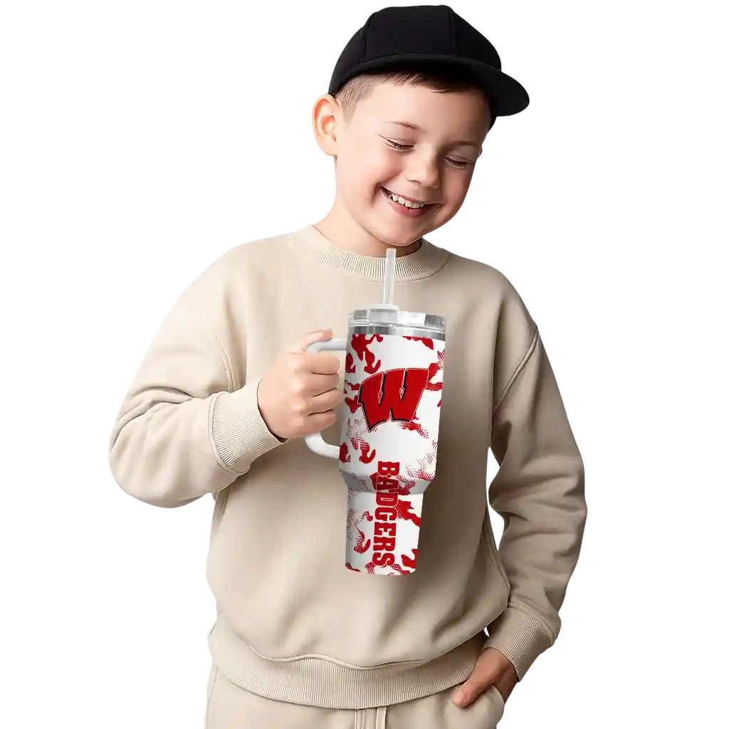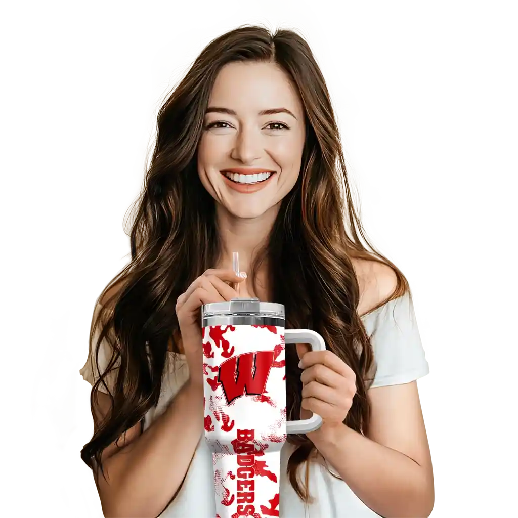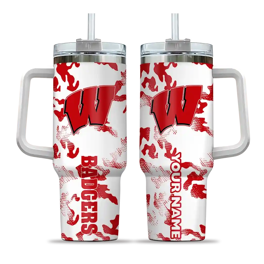 Personalized Wisconsin Badgers Camo Mashup Red White Curved Tumbler